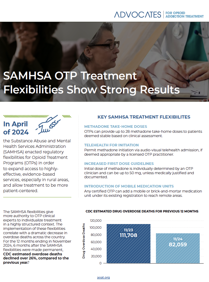 The SAMHSA flexibilities give more authority to OTP clinical experts to individualize treatment in a highly structured context. The implementation of these flexibilities correlates with a dramatic decrease in overdose deaths across the country. For the 12 months ending in November 2024, 6 months after SAMHSA flexibilities were made permanent, CDC estimated overdose deaths declined over 26% compared to the previous year.